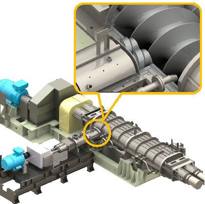 The twin-screw continuous kneader, "KRC Kneader" has the following mechanical characteristics, which result in minimal dead zones and allow for proper design and management of the gaps between screws at the connection points with downstream equipment.